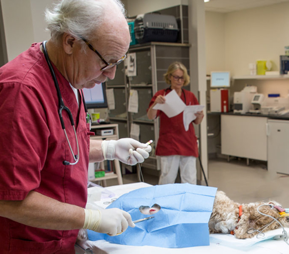 Vi tar emot alla typer av akutfall. Kräver patienten efter vår inledande behandling stationärvård stannar någon av oss kvar på kliniken, eller så remitterar vi patienten vidare till ett djursjukhus.